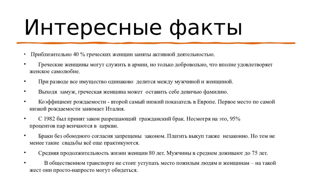 Приблизительно 40 % греческих женщин заняты активной деятельностью. Греческие женщины могут служить в армии, но только добровольно, что вполне удовлетворяет женское самолюбие. При разводе все имущество одинаково делится между мужчиной и женщиной. Выходя замуж, греческая женщина может оставить себе девичью фамилию. Коэффициент рождаемости - второй самый низкий показатель в Европе. Первое место по самой низкой рождаемости занимает Италия. С 1982 был принят закон разрешающий гражданский брак. Несмотря на это, 95% процентов пар венчаются в церкви. Браки без обоюдного согласия запрещены законом. Платить выкуп также незаконно. Но тем не менее такие свадьбы всё еще практикуются. Средняя продолжительность жизни женщин 80 лет. Мужчины в среднем доживают до 75 лет. В общественном транспорте не стоит уступать место пожилым людям и женщинам – на такой жест они просто-напросто могут обидеться.
