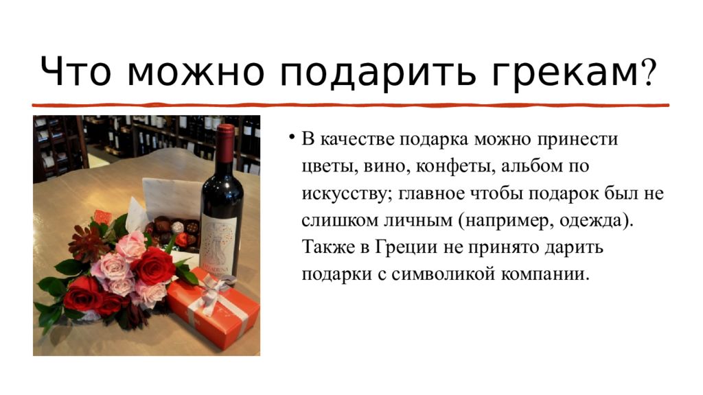 В качестве подарка можно принести цветы, вино, конфеты, альбом по искусству; главное чтобы подарок был не слишком личным (например, одежда). Также в Греции не принято дарить подарки с символикой компании.