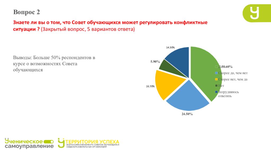 Выводы: Больше 50% респондентов в курсе о возможностях Совета обучающихся Знаете ли вы о том, что Совет обучающихся может регулировать конфликтные ситуации ? (Закрытый вопрос, 5 вариантов ответа) Вопрос 2