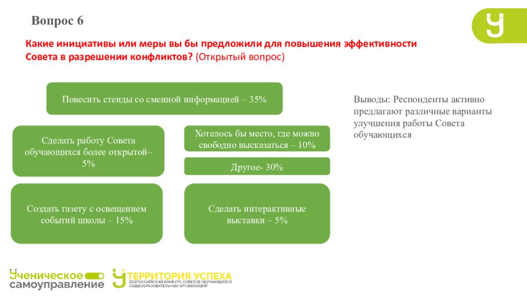 Выводы: Респонденты активно предлагают различные варианты улучшения работы Совета обучающихся Повесить стенды со сменной информацией – 35% Хотелось бы место, где можно свободно высказаться – 10% Сделать работу Совета обучающихся более открытой– 5% Создать газету с освещением событий школы – 15% Другое- 30% Сделать интерактивные выставки – 5% Какие инициативы или меры вы бы предложили для повышения эффективности Совета в разрешении конфликтов? (Открытый вопрос) Вопрос 6
