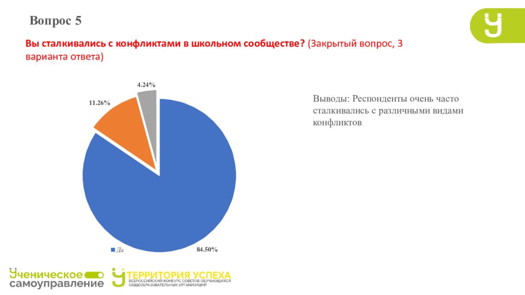 Выводы: Респонденты очень часто сталкивались с различными видами конфликтов Вы сталкивались с конфликтами в школьном сообществе? (Закрытый вопрос, 3 варианта ответа) Вопрос 5