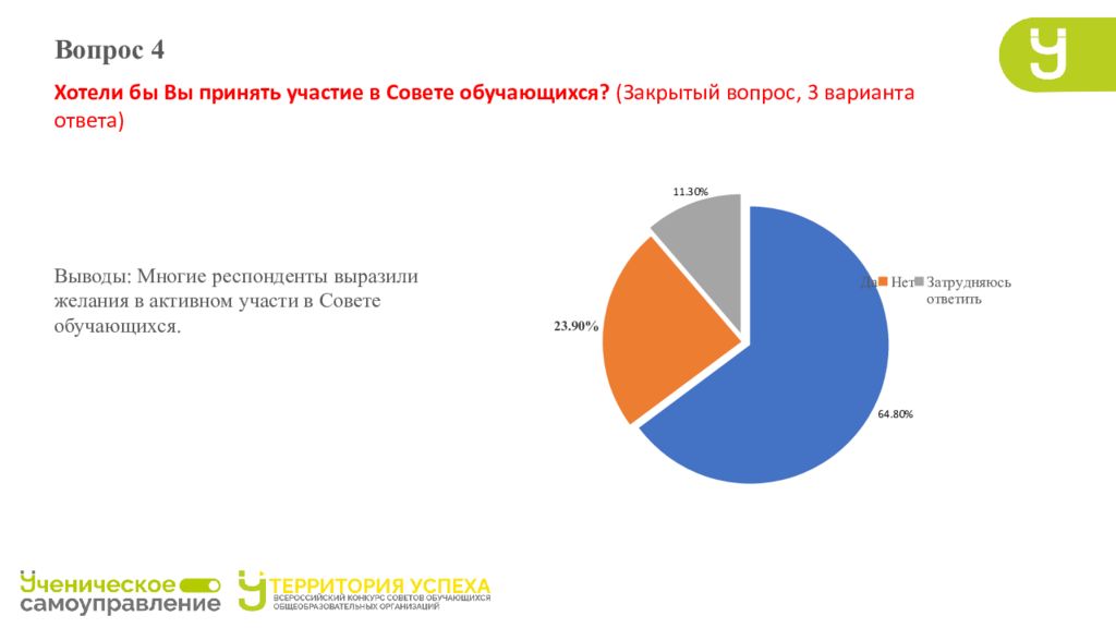 Выводы: Многие респонденты выразили желания в активном участи в Совете обучающихся. Хотели бы Вы принять участие в Совете обучающихся? (Закрытый вопрос, 3 варианта ответа) Вопрос 4