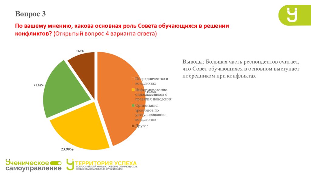 Выводы: Большая часть респондентов считает, что Совет обучающихся в основном выступает посредником при конфликтах По вашему мнению, какова основная роль Совета обучающихся в решении конфликтов? (Открытый вопрос 4 варианта ответа) Вопрос 3