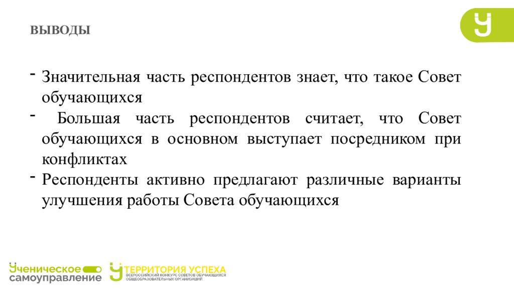 ВЫВОДЫ Значительная часть респондентов знает, что такое Совет обучающихся Большая часть респондентов считает, что Совет обучающихся в основном выступает посредником при конфликтах Респонденты активно предлагают различные варианты улучшения работы Совета обучающихся