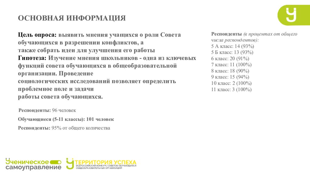 Цель опроса: выявить мнения учащихся о роли Совета обучающихся в разрешении конфликтов, а также собрать идеи для улучшения его работы Гипотеза: Изучение мнения школьников - одна из ключевых функций совета обучающихся в общеобразовательной организации. Проведение социологических исследований позволяет определить проблемное поле и задачи работы совета обучающихся. ОСНОВНАЯ ИНФОРМАЦИЯ Обучающиеся (5-11 классы): 101 человек Респонденты: 96 человек Респонденты: 95% от общего количества Респонденты ( в процентах от общего числа респондентов): 5 А класс: 14 (93%) 5 Б класс: 13 (93%) 6 класс: 20 (91%) 7 класс: 11 (100%) 8 класс: 18 (90%) 9 класс: 15 (94%) 10 класс: 2 (100%) 11 класс: 3 (100%)