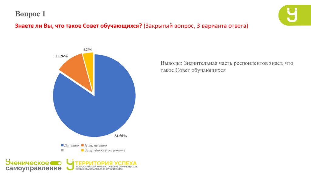 Знаете ли Вы, что такое Совет обучающихся? (Закрытый вопрос, 3 варианта ответа) Вопрос 1 Выводы: Значительная часть респондентов знает, что такое Совет обучающихся