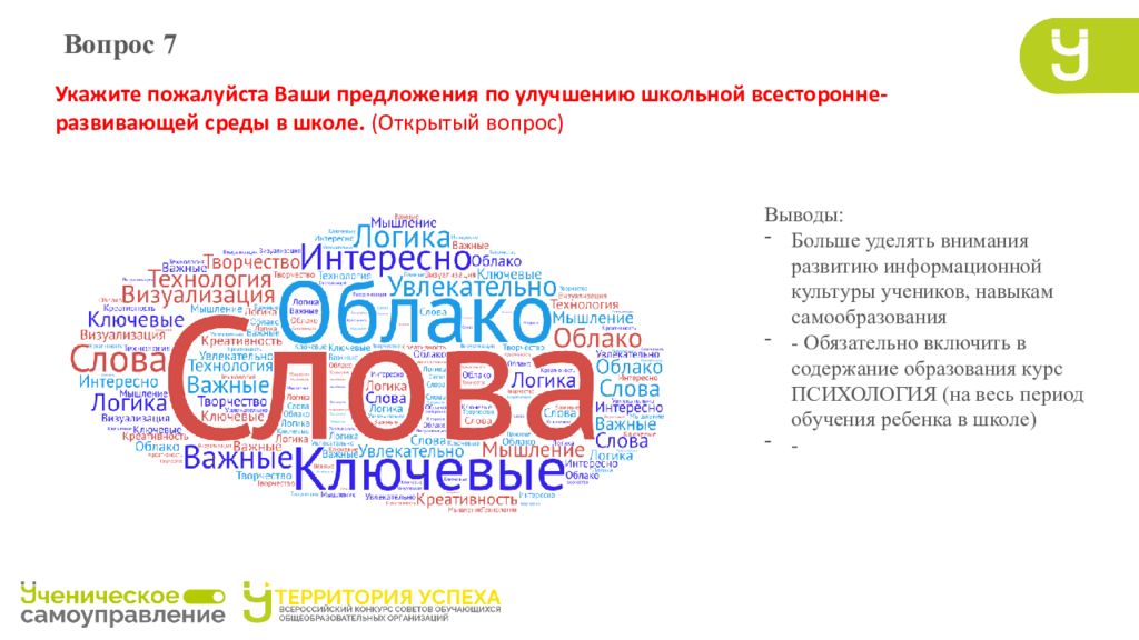 Выводы: Больше уделять внимания развитию информационной культуры учеников, навыкам самообразования - Обязательно включить в содержание образования курс ПСИХОЛОГИЯ (на весь период обучения ребенка в школе) - Укажите пожалуйста Ваши предложения по улучшению школьной всесторонне-развивающей среды в школе. (Открытый вопрос) Вопрос 7