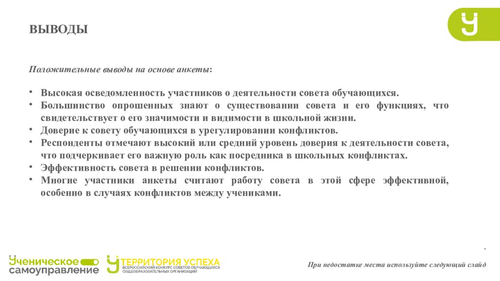 ВЫВОДЫ Положительные выводы на основе анкеты : Высокая осведомленность участников о деятельности совета обучающихся. Большинство опрошенных знают о существовании совета и его функциях, что свидетельствует о его значимости и видимости в школьной жизни. Доверие к совету обучающихся в урегулировании конфликтов. Респонденты отмечают высокий или средний уровень доверия к деятельности совета, что подчеркивает его важную роль как посредника в школьных конфликтах. Эффективность совета в решении конфликтов. Многие участники анкеты считают работу совета в этой сфере эффективной, особенно в случаях конфликтов между учениками. . При недостатке места используйте следующий слайд