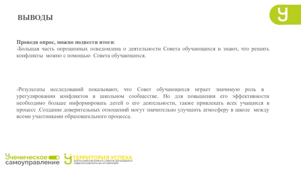 ВЫВОДЫ Проведя опрос, можно подвести итоги : -Большая часть опрошенных осведомлена о деятельности Совета обучающихся и знают, что решить конфликты можно с помощью Совета обучающихся. -Результаты исследований показывают, что Совет обучающихся играет значимую роль в урегулировании конфликтов в школьном сообществе. Но для повышения его эффективности необходимо больше информировать детей о его деятельности, также привлекать всех учащихся в процесс.Создание доверительных отношений могут значительно улучшить атмосферу в школе между всеми участниками образовательного процесса.