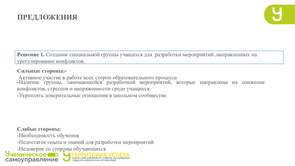 ПРЕДЛОЖЕНИЯ Решение 1. Создание специальной группы учащихся для разработки мероприятий,направленных на урегулирование конфликтов. Сильные стороны:- Активное участие в работе всех сторон образовательного процесса - Наличие группы, занимающейся разработкой мероприятий, которые направлены на снижение конфликтов, стрессов и напряженности среди учащихся. -Укреплять доверительные отношения в школьном сообществе. Слабые стороны: -Необходимость обучения -Недостаток опыта и знаний для разработки мероприятий -Недоверие со стороны обучающихся