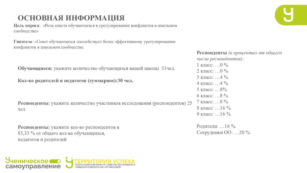 Цель опроса : «Роль совета обучающихся в урегулировании конфликтов в школьном сообществе» Гипотеза : «Совет обучающихся способствует более эффективному урегулированию конфликтов в школьном сообществе. ОСНОВНАЯ ИНФОРМАЦИЯ Обучающиеся: укажите количество обучающихся вашей школы 31чел. Кол-во родителей и педагогов (суммарное):30 чел. Респонденты: укажите количество участников исследования (респондентов) 25 чел Респонденты: укажите кол-во респондентов в 83,33 % от общего кол-ва обучающихся, педагогов и родителей Респонденты ( в процентах от общего числа респондентов): 1 класс : …0 % 2 класс : …0 % 3 класс : …4 % 4 класс : …4 % 5 класс : …8% 6 класс : …8 % 7 класс : …8 % 8 класс : …16 % 9 класс : …16 % Родители: …16 % Сотрудники ОО: …20 %
