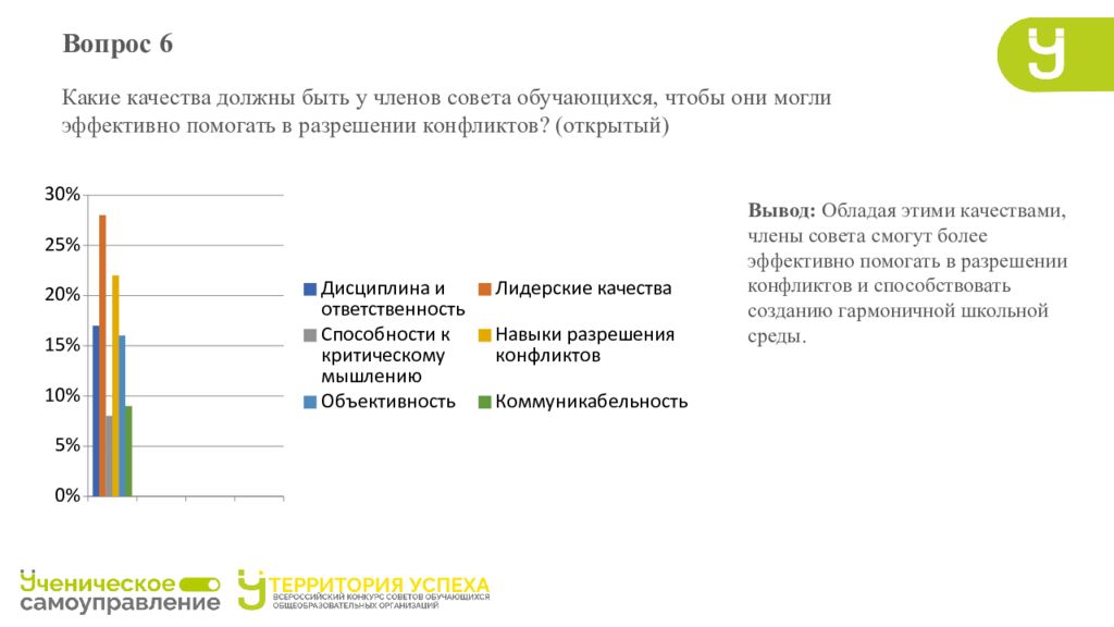 Вывод: Обладая этими качествами, члены совета смогут более эффективно помогать в разрешении конфликтов и способствовать созданию гармоничной школьной среды. Какие качества должны быть у членов совета обучающихся, чтобы они могли эффективно помогать в разрешении конфликтов? (открытый) Вопрос 6