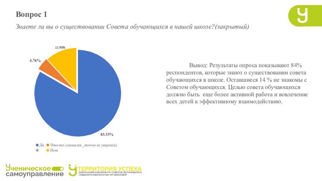 Знаете ли вы о существовании Совета обучающихся в нашей школе?(закрытый) Вопрос 1 Вывод: Результаты опроса показывают 84% респондентов, которые знают о существовании совета обучающихся в школе. Оставшиеся 14 % не знакомы с Советом обучающихся. Целью совета обучающихся должно быть еще более активной работа и вовлечение всех детей к эффективному взаимодействию.