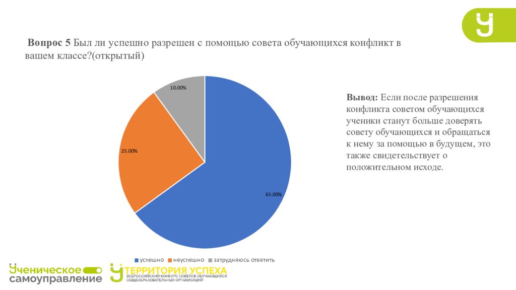 Вывод: Если после разрешения конфликта советом обучающихся ученики станут больше доверять совету обучающихся и обращаться к нему за помощью в будущем, это также свидетельствует о положительном исходе. Вопрос 5 Был ли успешно разрешен с помощью совета обучающихся конфликт в вашем классе ?(открытый)