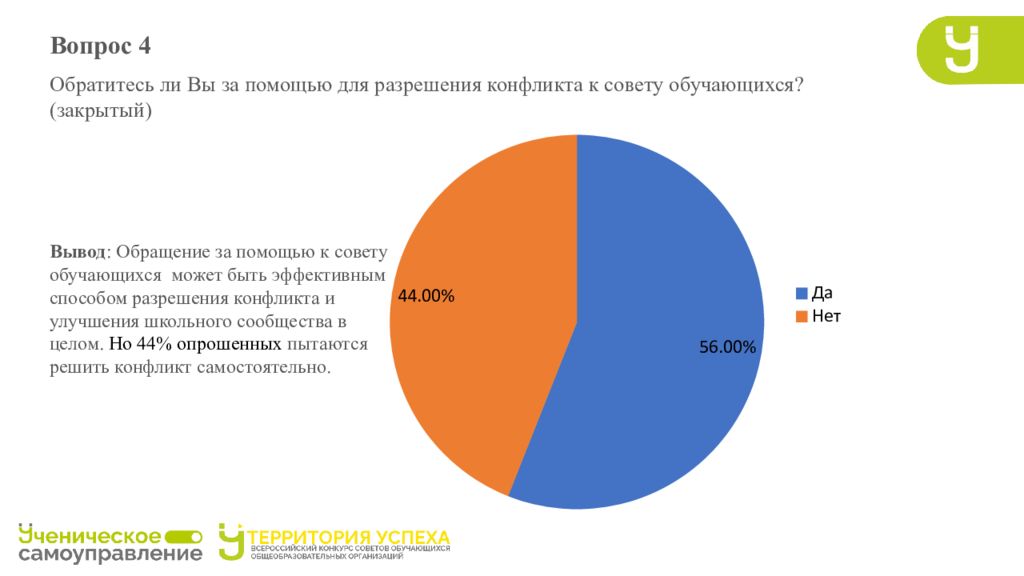 Вывод : Обращение за помощью к совету обучающихся может быть эффективным способом разрешения конфликта и улучшения школьного сообщества в целом. Но 44% опрошенных пытаются решить конфликт самостоятельно. Обратитесь ли Вы за помощью для разрешения конфликта к совету обучающихся? (закрытый) Вопрос 4