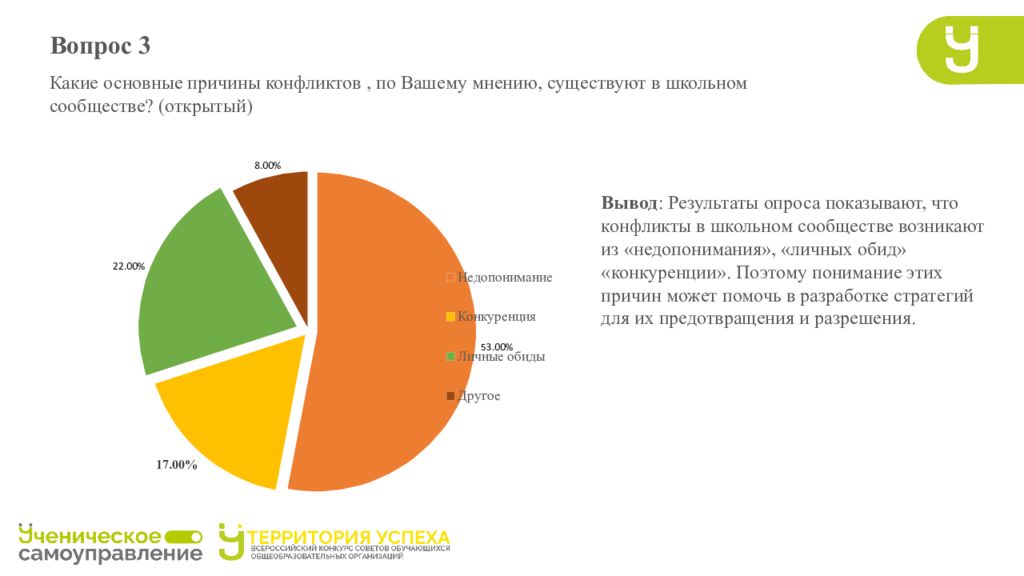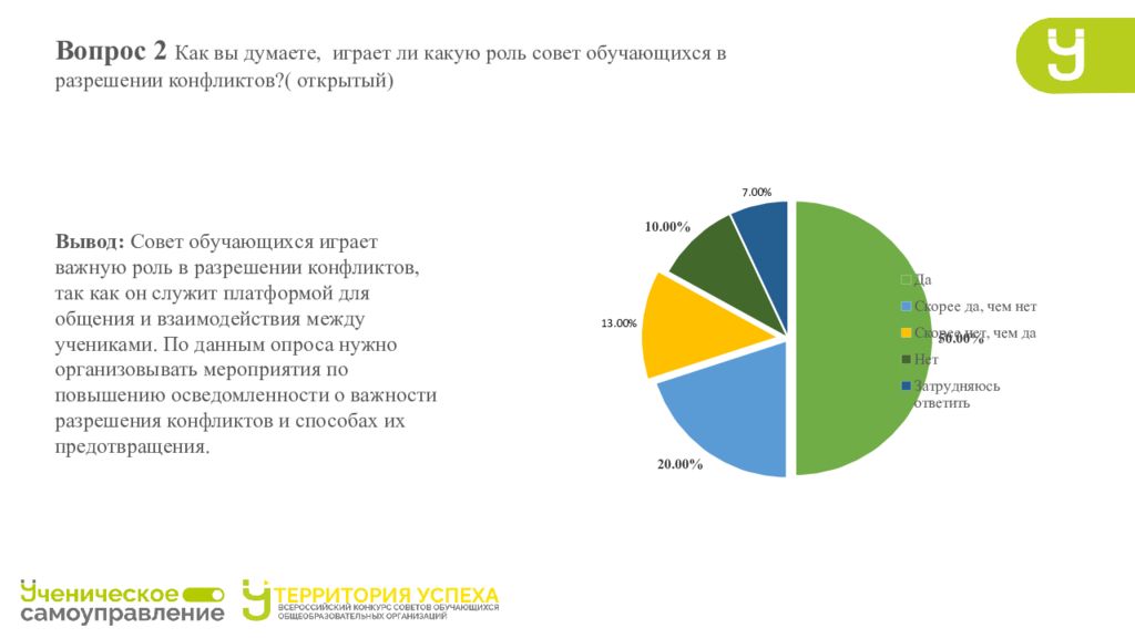 Вывод: Совет обучающихся играет важную роль в разрешении конфликтов, так как он служит платформой для общения и взаимодействия между учениками. По данным опроса нужно организовывать мероприятия по повышению осведомленности о важности разрешения конфликтов и способах их предотвращения. Вопрос 2 Как вы думаете, играет ли какую роль совет обучающихся в разрешении конфликтов ?( открытый)