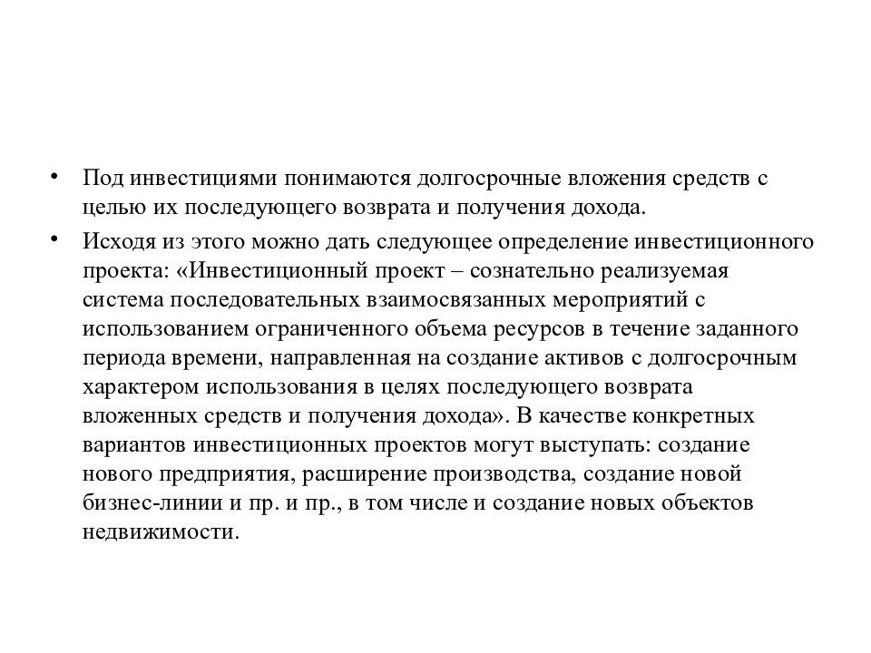 Под инвестициями понимаются долгосрочные вложения средств с целью их последующего возврата и получения дохода. Исходя из этого можно дать следующее определение инвестиционного проекта: «Инвестиционный проект – сознательно реализуемая система последовательных взаимосвязанных мероприятий с использованием ограниченного объема ресурсов в течение заданного периода времени, направленная на создание активов с долгосрочным характером использования в целях последующего возврата вложенных средств и получения дохода». В качестве конкретных вариантов инвестиционных проектов могут выступать: создание нового предприятия, расширение производства, создание новой бизнес-линии и пр. и пр., в том числе и создание новых объектов недвижимости.