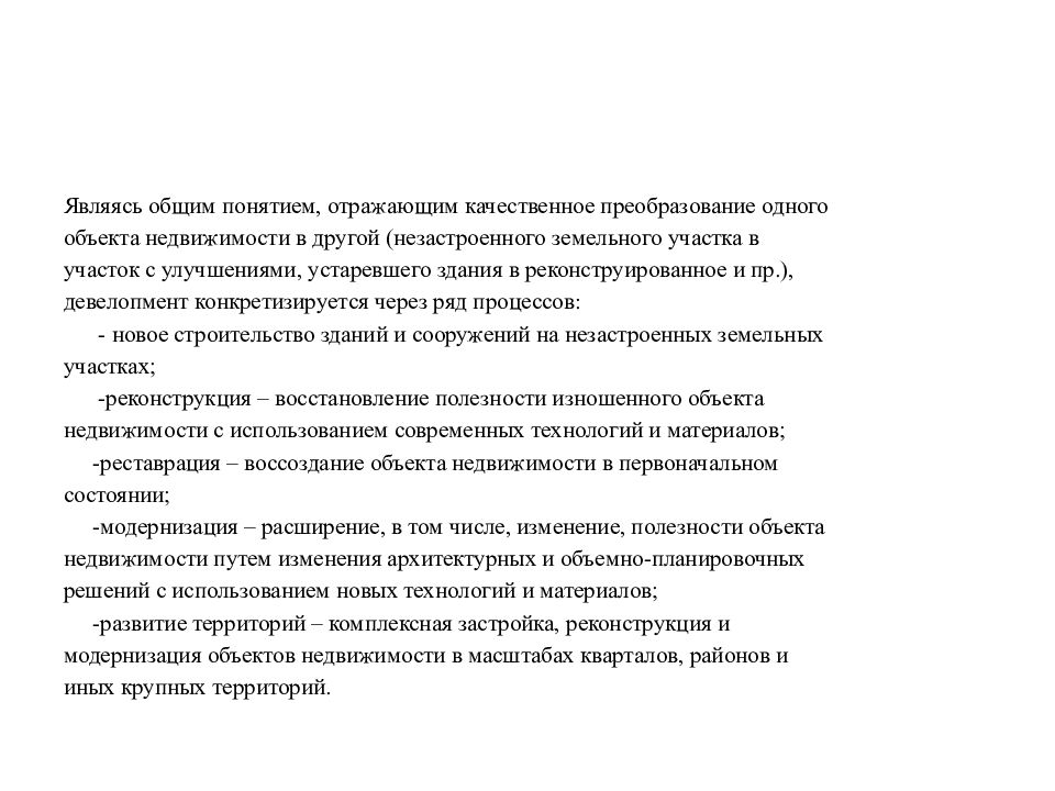 Являясь общим понятием, отражающим качественное преобразование одного объекта недвижимости в другой (незастроенного земельного участка в участок с улучшениями, устаревшего здания в реконструированное и пр.), девелопмент конкретизируется через ряд процессов: - новое строительство зданий и сооружений на незастроенных земельных участках ; - реконструкция – восстановление полезности изношенного объекта недвижимости с использованием современных технологий и материалов; - реставрация – воссоздание объекта недвижимости в первоначальном состоянии ; - модернизация – расширение, в том числе, изменение, полезности объекта недвижимости путем изменения архитектурных и объемно-планировочных решений с использованием новых технологий и материалов; - развитие территорий – комплексная застройка, реконструкция и модернизация объектов недвижимости в масштабах кварталов, районов и иных крупных территорий.