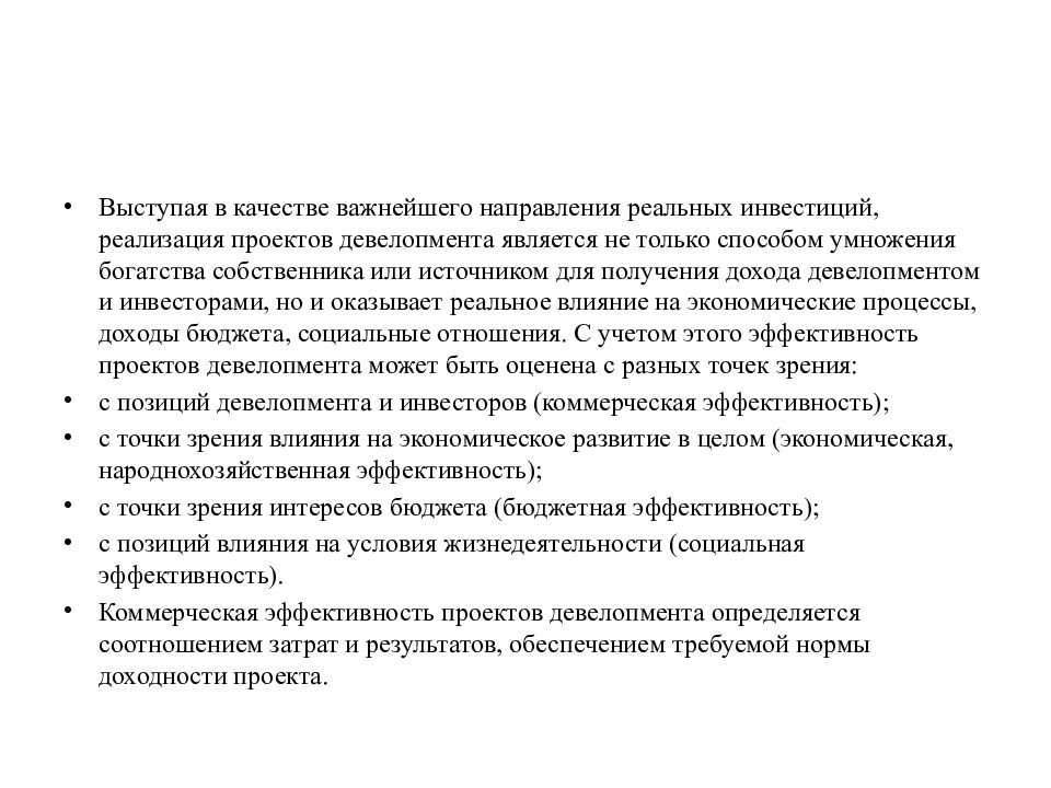 Выступая в качестве важнейшего направления реальных инвестиций, реализация проектов девелопмента является не только способом умножения богатства собственника или источником для получения дохода девелопментом и инвесторами, но и оказывает реальное влияние на экономические процессы, доходы бюджета, социальные отношения. С учетом этого эффективность проектов девелопмента может быть оценена с разных точек зрения: с позиций девелопмента и инвесторов (коммерческая эффективность); с точки зрения влияния на экономическое развитие в целом (экономическая, народнохозяйственная эффективность); с точки зрения интересов бюджета (бюджетная эффективность); с позиций влияния на условия жизнедеятельности (социальная эффективность). Коммерческая эффективность проектов девелопмента определяется соотношением затрат и результатов, обеспечением требуемой нормы доходности проекта.