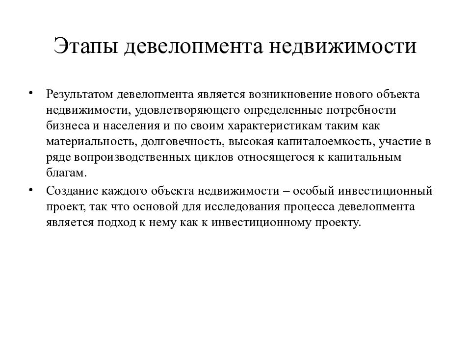Результатом девелопмента является возникновение нового объекта недвижимости, удовлетворяющего определенные потребности бизнеса и населения и по своим характеристикам таким как материальность, долговечность, высокая капиталоемкость, участие в ряде вопроизводственных циклов относящегося к капитальным благам. Создание каждого объекта недвижимости – особый инвестиционный проект, так что основой для исследования процесса девелопмента является подход к нему как к инвестиционному проекту.
