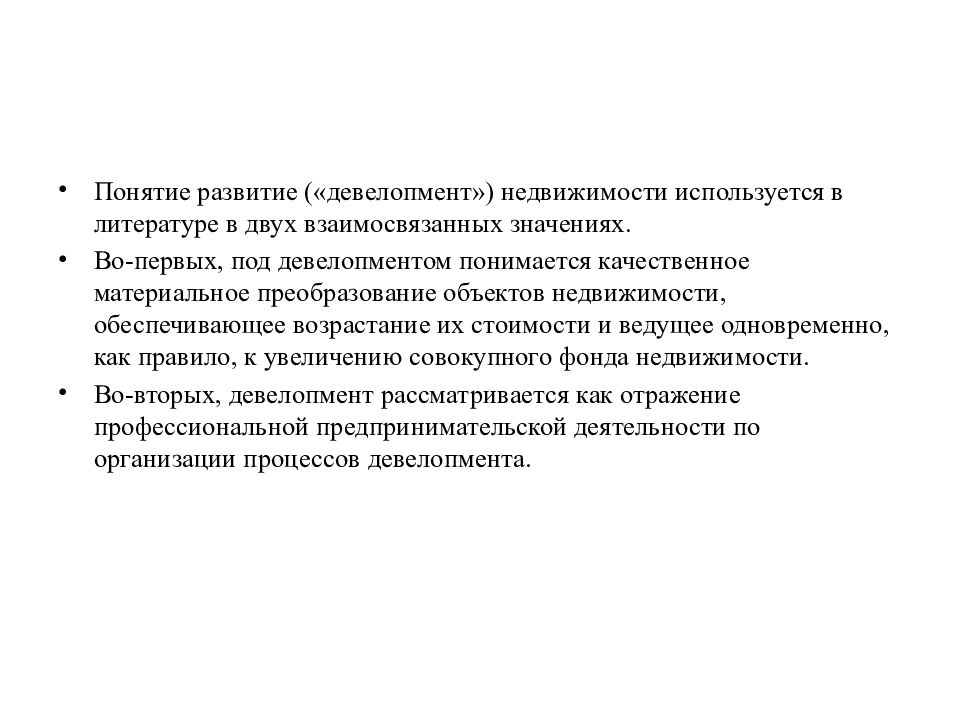 Понятие развитие (« девелопмент ») недвижимости используется в литературе в двух взаимосвязанных значениях. Во-первых, под девелопментом понимается качественное материальное преобразование объектов недвижимости, обеспечивающее возрастание их стоимости и ведущее одновременно, как правило, к увеличению совокупного фонда недвижимости. Во-вторых, девелопмент рассматривается как отражение профессиональной предпринимательской деятельности по организации процессов девелопмента.