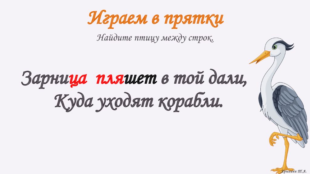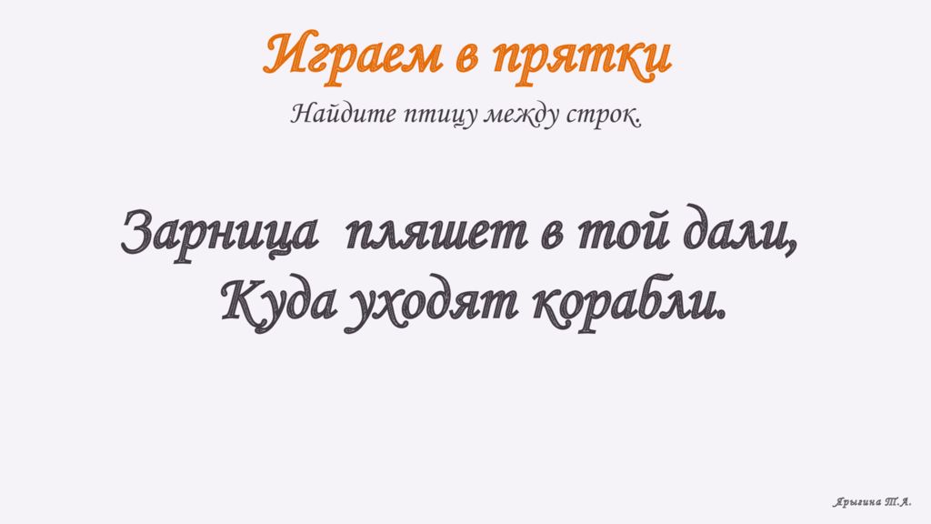 Играем в прятки Найдите птицу между строк. Зарница пляшет в той дали, Куда уходят корабли. Ярыгина Т.А.