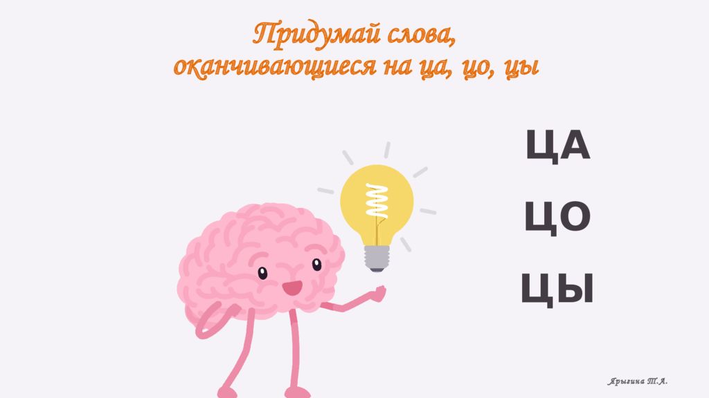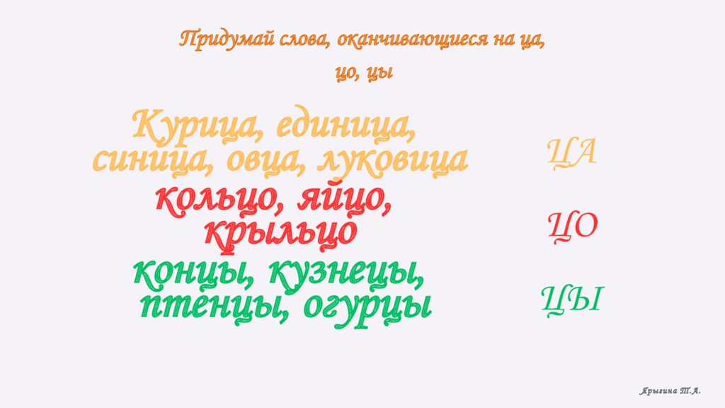 Придумай слова, оканчивающиеся на ца, цо, цы ЦА ЦО ЦЫ Курица, единица, синица, овца, луковица кольцо, яйцо, крыльцо концы, кузнецы, птенцы, огурцы Ярыгина Т.А.