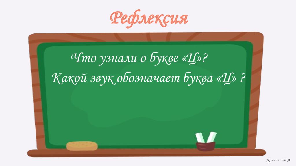 Рефлексия Что узнали о букве «Ц» ? Какой звук обозначает буква «Ц» ? Ярыгина Т.А.