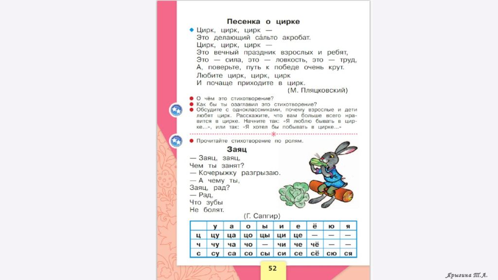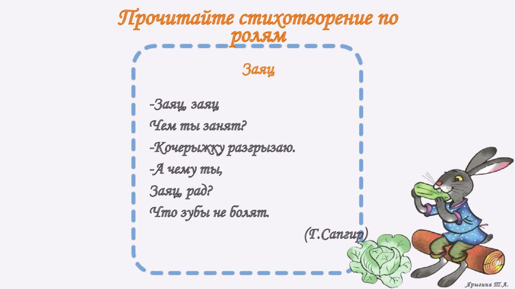 - Заяц, заяц Чем ты занят ? - Кочерыжку разгрызаю. -А чему ты, Заяц, рад ? Что зубы не болят. ( Г.Сапгир ) Прочитайте стихотворение по ролям Заяц Ярыгина Т.А.