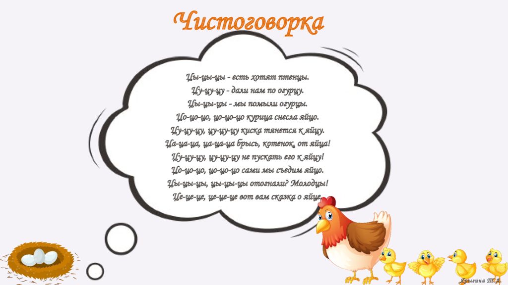 Цы-цы-цы - есть хотят птенцы. Цу-цу-цу - дали нам по огурцу. Цы-цы-цы - мы помыли огурцы. Цо-цо-цо, цо-цо-цо курица снесла яйцо. Цу-цу-цу, цу-цу-цу киска тянется к яйцу. Ца-ца-ца, ца-ца-ца брысь, котенок, от яйца ! Цу-цу-цу, цу-цу-цу не пускать его к яйцу ! Цо-цо-цо, цо-цо-цо сами мы съедим яйцо. Цы-цы-цы, цы-цы-цы отогнали ? Молодцы ! Це-це-це, це-це-це вот вам сказка о яйце. Чистоговорка Ярыгина Т.А.