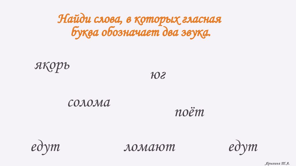 Найди слова, в которых гласная буква обозначает два звука. якорь солома юг поёт едут ломают едут Ярыгина Т.А.