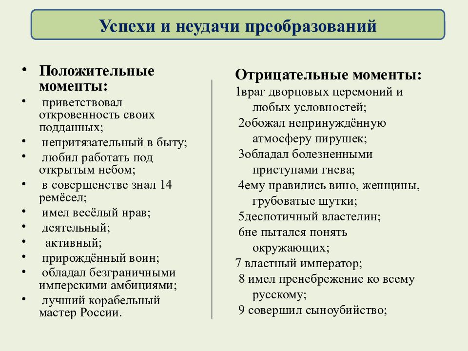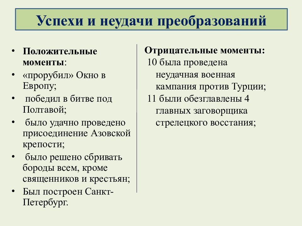 Положительные моменты : «прорубил» Окно в Европу; победил в битве под Полтавой; было удачно проведено присоединение Азовской крепости; было решено сбривать бороды всем, кроме священников и крестьян; Был построен Санкт-Петербург. Отрицательные моменты: 10 была проведена неудачная военная кампания против Турции; 11 были обезглавлены 4 главных заговорщика стрелецкого восстания; Успехи и неудачи преобразований