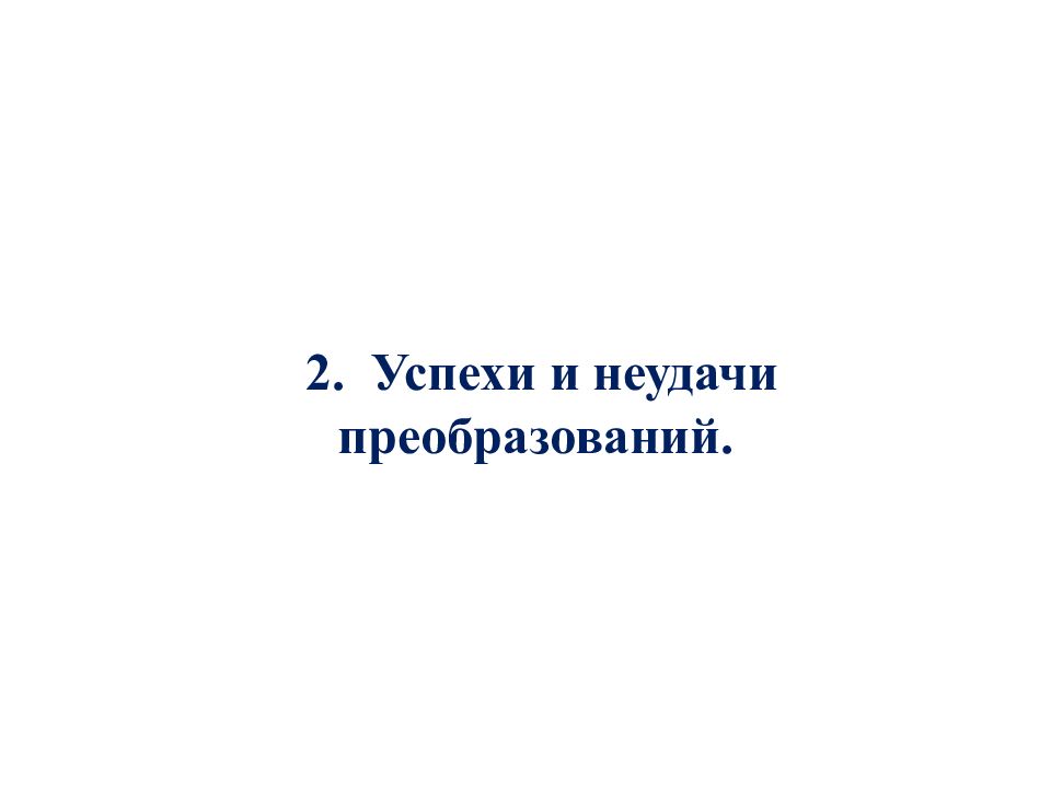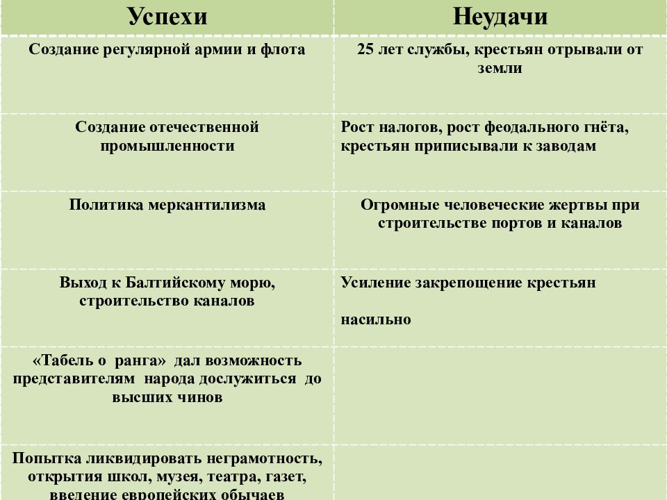 Успехи Неудачи Создание регулярной армии и флота 25 лет службы, крестьян отрывали от земли Создание отечественной промышленности Рост налогов, рост феодального гнёта, крестьян приписывали к заводам Политика меркантилизма Огромные человеческие жертвы при строительстве портов и каналов Выход к Балтийскому морю, строительство каналов Усиление закрепощение крестьян насильно «Табель о ранга» дал возможность представителям народа дослужиться до высших чинов Попытка ликвидировать неграмотность, открытия школ, музея, театра, газет, введение европейских обычаев