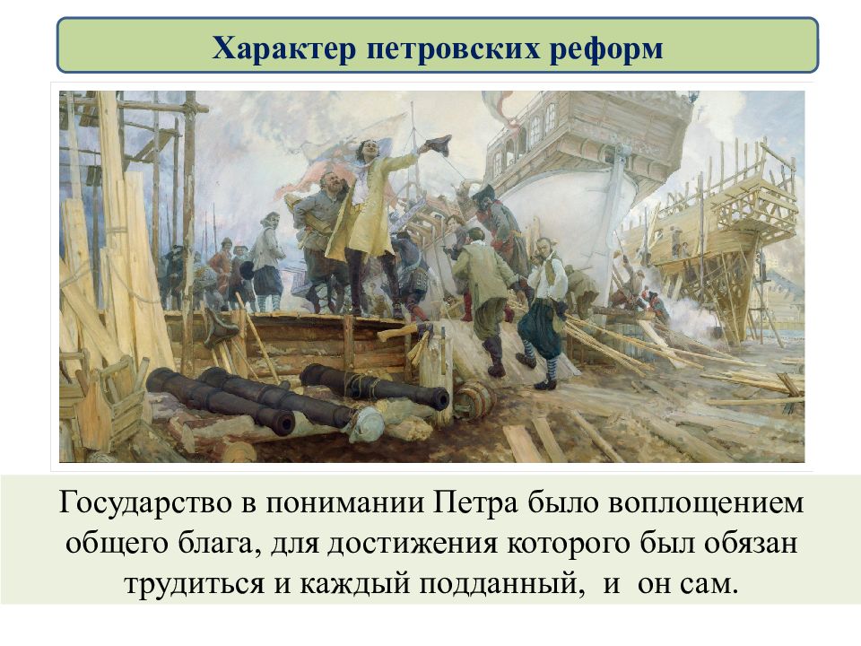 Государство в понимании Петра было воплощением общего блага, для достижения которого был обязан трудиться и каждый подданный, и он сам. Характер петровских реформ