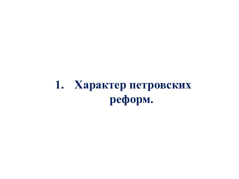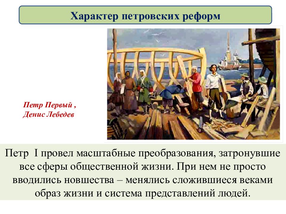 Петр I провел масштабные преобразования, затронувшие все сферы общественной жизни. При нем не просто вводились новшества – менялись сложившиеся веками образ жизни и система представлений людей. Петр Первый, Денис Лебедев Характер петровских реформ