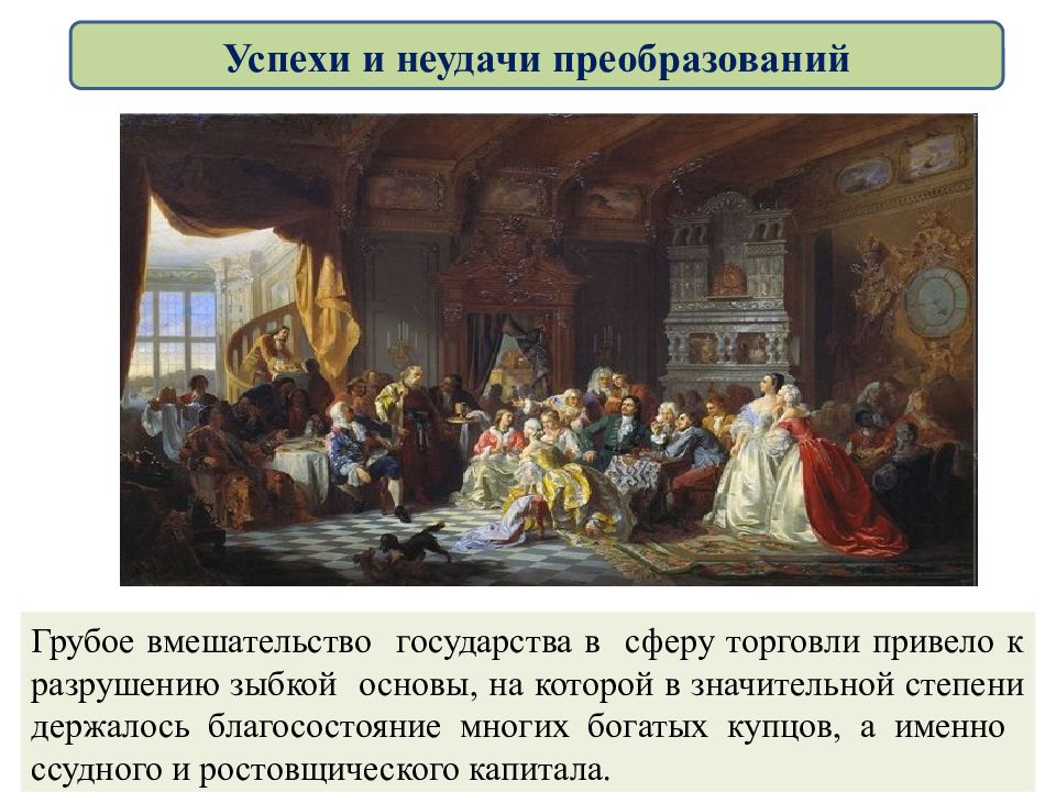 Грубое вмешательство государства в сферу торговли привело к разрушению зыбкой основы, на которой в значительной степени держалось благосостояние многих богатых купцов, а именно ссудного и ростовщического капитала. Успехи и неудачи преобразований
