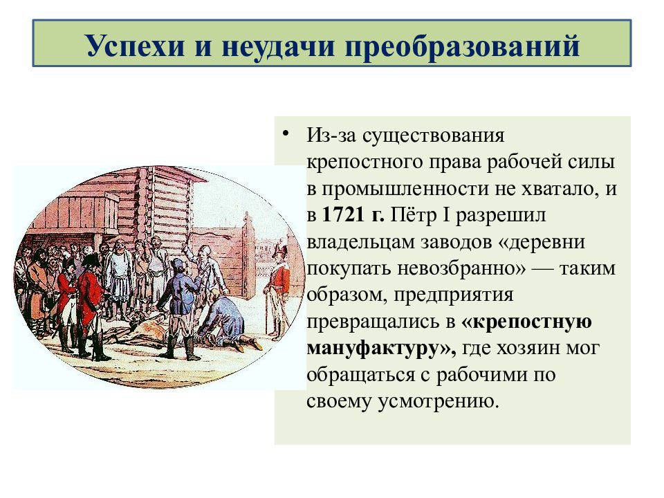Из-за существования крепостного права рабочей силы в промышленности не хватало, и в 1721 г. Пётр I разрешил владельцам заводов «деревни покупать невозбранно» — таким образом, предприятия превращались в «крепостную мануфактуру», где хозяин мог обращаться с рабочими по своему усмотрению. Успехи и неудачи преобразований