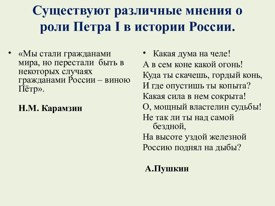 «Мы стали гражданами мира, но перестали быть в некоторых случаях гражданами России – виною Пётр». Н.М. Карамзин Какая дума на челе! А в сем коне какой огонь! Куда ты скачешь, гордый конь, И где опустишь ты копыта? Какая сила в нем сокрыта! О, мощный властелин судьбы! Не так ли ты над самой бездной, На высоте уздой железной Россию поднял на дыбы? А.Пушкин