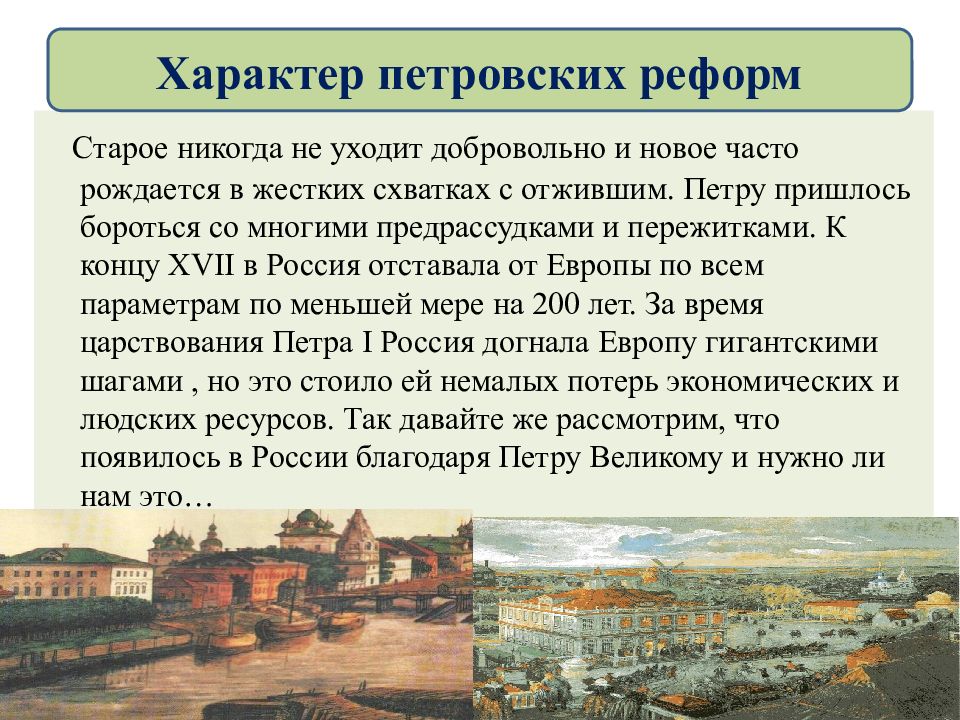 Старое никогда не уходит добровольно и новое часто рождается в жестких схватках с отжившим. Петру пришлось бороться со многими предрассудками и пережитками. К концу ХVII в Россия отставала от Европы по всем параметрам по меньшей мере на 200 лет. За время царствования Петра I Россия догнала Европу гигантскими шагами, но это стоило ей немалых потерь экономических и людских ресурсов. Так давайте же рассмотрим, что появилось в России благодаря Петру Великому и нужно ли нам это… Характер петровских реформ
