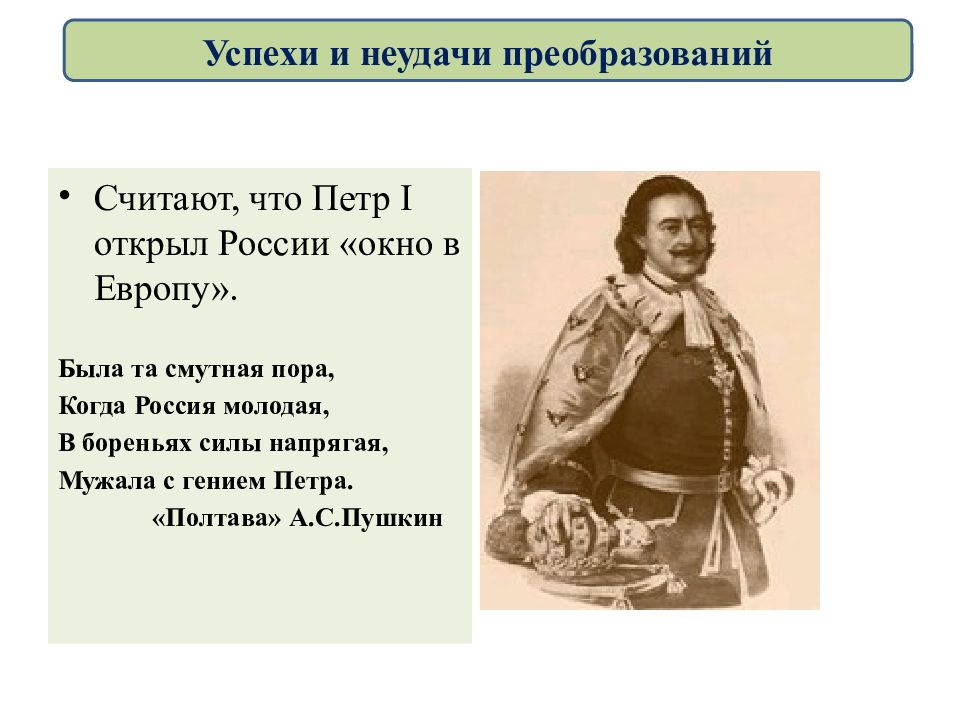 Считают, что Петр I открыл России «окно в Европу». Была та смутная пора, Когда Россия молодая, В бореньях силы напрягая, Мужала с гением Петра. «Полтава» А.С.Пушкин Успехи и неудачи преобразований