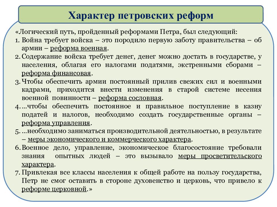 «Логический путь, пройденный реформами Петра, был следующий: Война требует войска – это породило первую заботу правительства – об армии – реформа военная. Содержание войска требует денег, денег можно достать в государстве, у населения, облагая его налогами податями, экстренными сборами – реформа финансовая. Чтобы обеспечить армии постоянный прилив свежих сил и военными кадрами, приходится внести изменения в старой системе несения военной повинности – реформа сословная. …чтобы обеспечить постоянное и правильное поступление в казну податей и налогов, необходимо создать государственные органы – реформа управления. …необходимо заниматься производительной деятельностью, в результате – меры экономического и коммерческого характера. Военное дело, управление, экономическое благосостояние требовали знания опытных людей – это вызывало меры просветительского характера. Привлекая все классы населения к общей работе на пользу государства, Петр не смог оставить в стороне духовенство и церковь, что привело к реформе церковной.» Характер петровских реформ