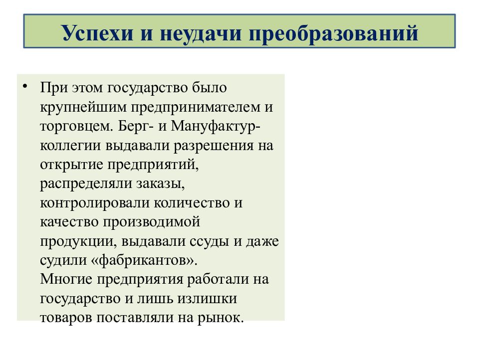При этом государство было крупнейшим предпринимателем и торговцем. Берг- и Мануфактур-коллегии выдавали разрешения на открытие предприятий, распределяли заказы, контролировали количество и качество производимой продукции, выдавали ссуды и даже судили «фабрикантов». Многие предприятия работали на государство и лишь излишки товаров поставляли на рынок. Успехи и неудачи преобразований