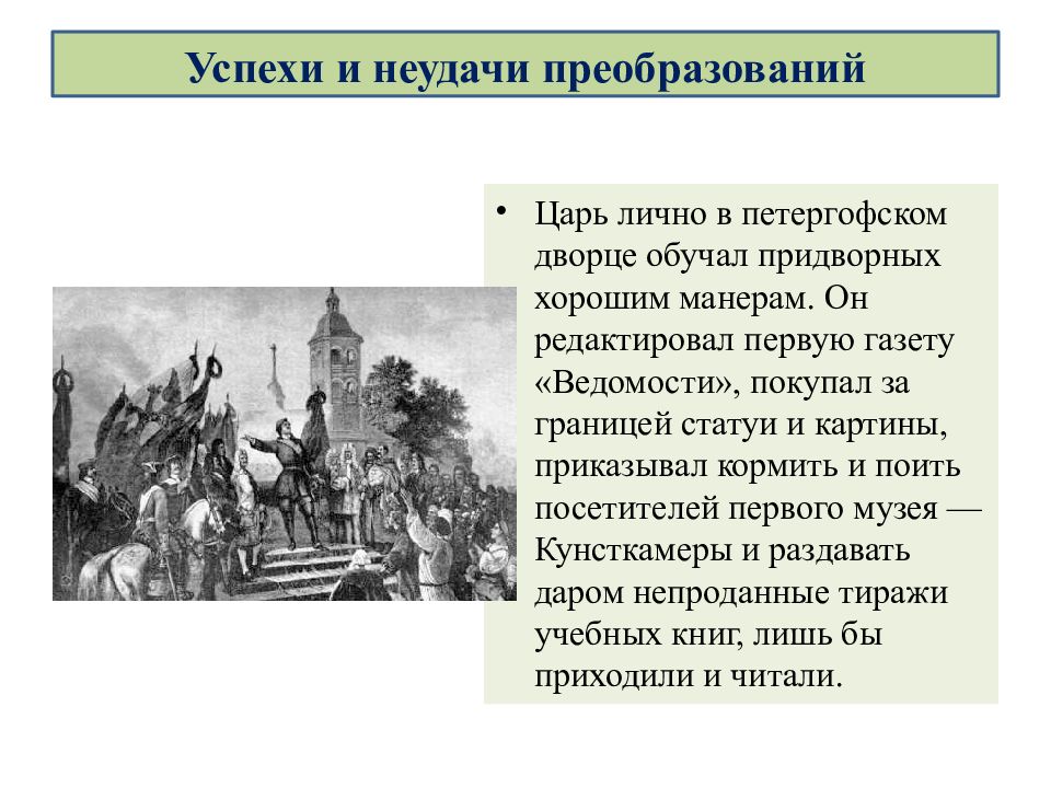 Царь лично в петергофском дворце обучал придворных хорошим манерам. Он редактировал первую газету «Ведомости», покупал за границей статуи и картины, приказывал кормить и поить посетителей первого музея — Кунсткамеры и раздавать даром непроданные тиражи учебных книг, лишь бы приходили и читали. Успехи и неудачи преобразований