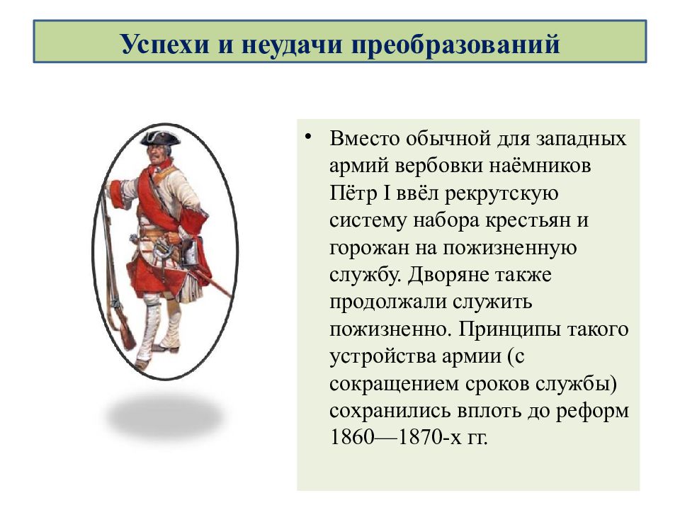 Вместо обычной для западных армий вербовки наёмников Пётр I ввёл рекрутскую систему набора крестьян и горожан на пожизненную службу. Дворяне также продолжали служить пожизненно. Принципы такого устройства армии (с сокращением сроков службы) сохранились вплоть до реформ 1860—1870-х гг. Успехи и неудачи преобразований