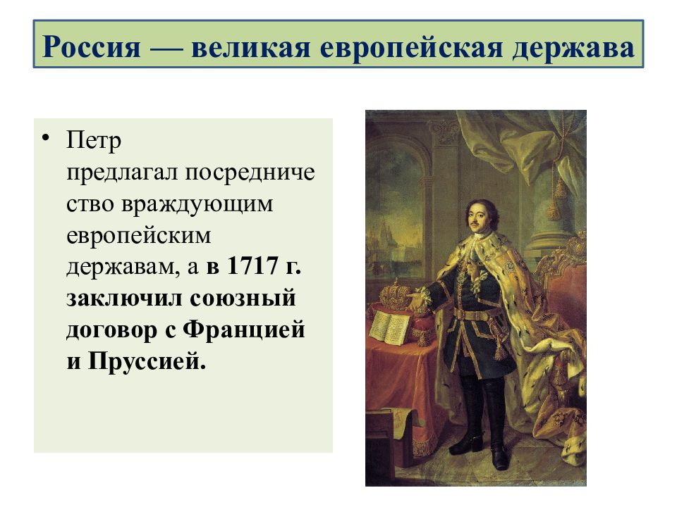 Петр предлагал посредничество враждующим европейским державам, а в 1717 г. заключил союзный договор с Францией и Пруссией. Россия — великая европейская держава