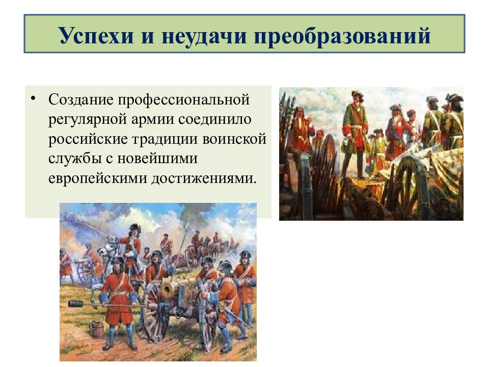 Создание профессиональной регулярной армии соединило российские традиции воинской службы с новейшими европейскими достижениями. Успехи и неудачи преобразований