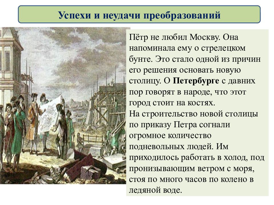 Пётр не любил Москву. Она напоминала ему о стрелецком бунте. Это стало одной из причин его решения основать новую столицу. О Петербурге с давних пор говорят в народе, что этот город стоит на костях. На строительство новой столицы по приказу Петра согнали огромное количество подневольных людей. Им приходилось работать в холод, под пронизывающим ветром с моря, стоя по много часов по колено в ледяной воде. Успехи и неудачи преобразований
