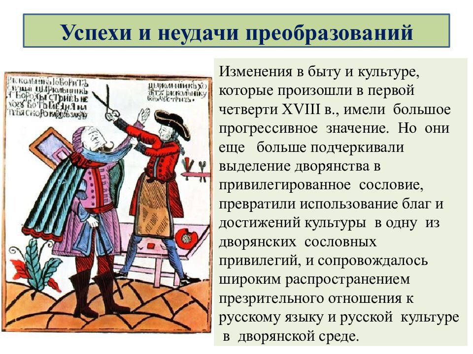 Изменения в быту и культуре, которые произошли в первой четверти XVIII в., имели большое прогрессивное значение. Но они еще больше подчеркивали выделение дворянства в привилегированное сословие, превратили использование благ и достижений культуры в одну из дворянских сословных привилегий, и сопровождалось широким распространением презрительного отношения к русскому языку и русской культуре в дворянской среде. Успехи и неудачи преобразований