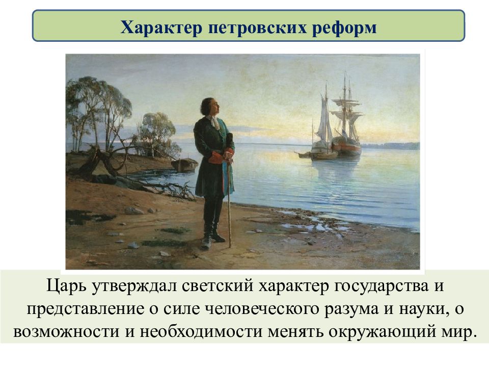 Царь утверждал светский характер государства и представление о силе человеческого разума и науки, о возможности и необходимости менять окружающий мир. Характер петровских реформ