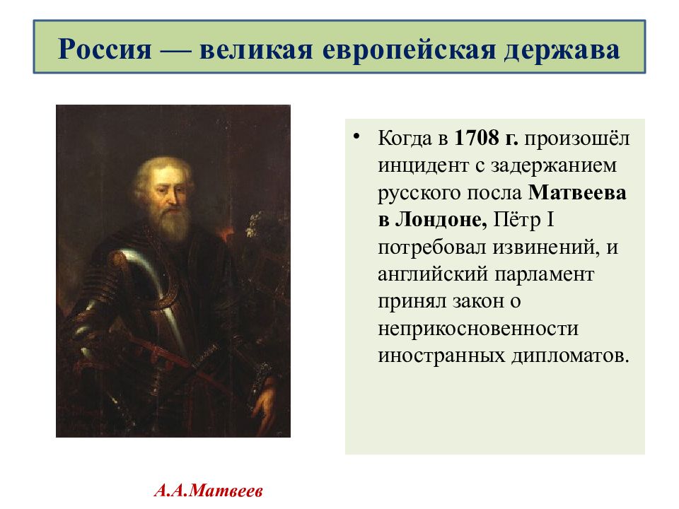 Когда в 1708 г. произошёл инцидент с задержанием русского посла Матвеева в Лондоне, Пётр I потребовал извинений, и английский парламент принял закон о неприкосновенности иностранных дипломатов. А.А.Матвеев Россия — великая европейская держава